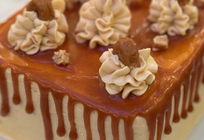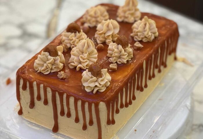 A warm, spiced embrace in every slice. Our Pumpkin Cake is crafted with velvety pumpkin purée and a delicate blend of cinnamon, nutmeg, and clove, creating a sponge that’s moist, aromatic, and deeply comforting. Between the layers, you’ll find smooth, spiced cream filling, lightly whipped and subtly sweet to balance the richness of the cake. Topped with a silky glaze and a touch of crumble for texture, this cake is autumn in dessert form. It’s the perfect blend of rustic charm and refined indulgence, ideal for cosy gatherings, seasonal celebrations, or simply savouring the taste of fall.