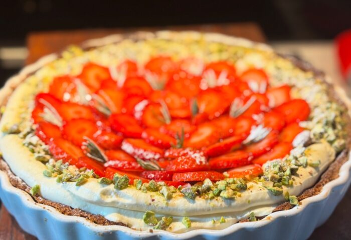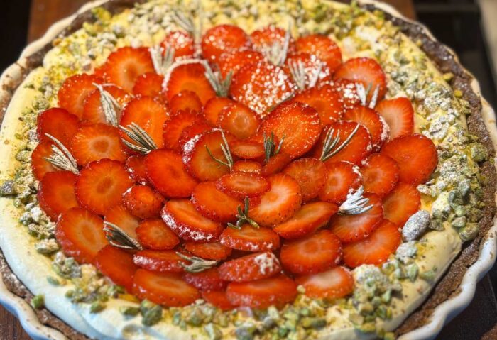 Our Strawberry Tart is a feast for both the eyes and the palate. A crisp pastry base holds layers of silky cream, topped with hand-sliced strawberries arranged in a striking pattern. Finished with a delicate ring of crushed pistachios for colour, texture, and a hint of nutty richness, this tart is light, elegant, and irresistibly fresh. Perfect for summer gatherings, celebrations, or simply indulging in something special.