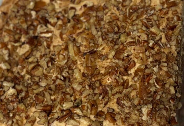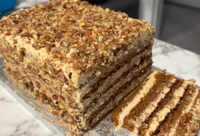 Soft toffee sponge, silky caramel, and a pecan crunch, this is comfort with a golden crown.